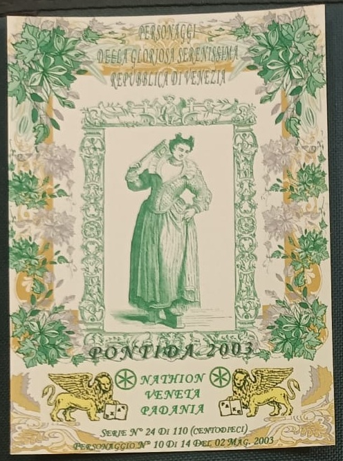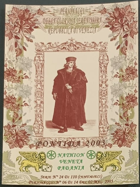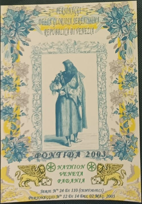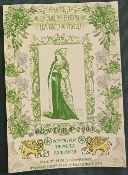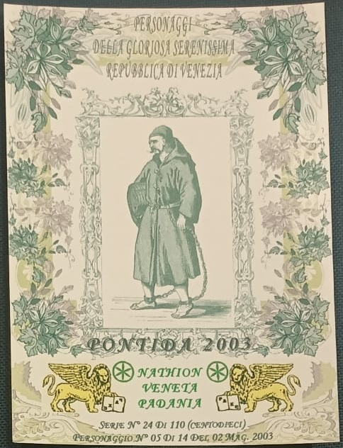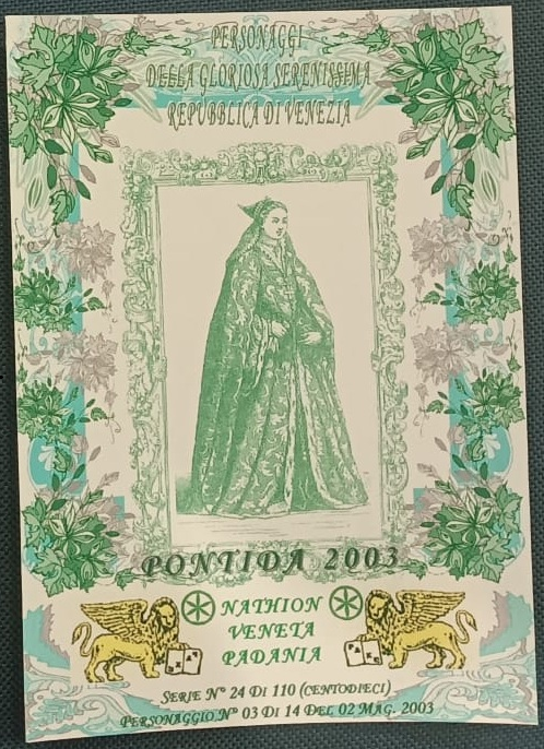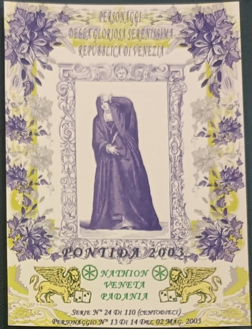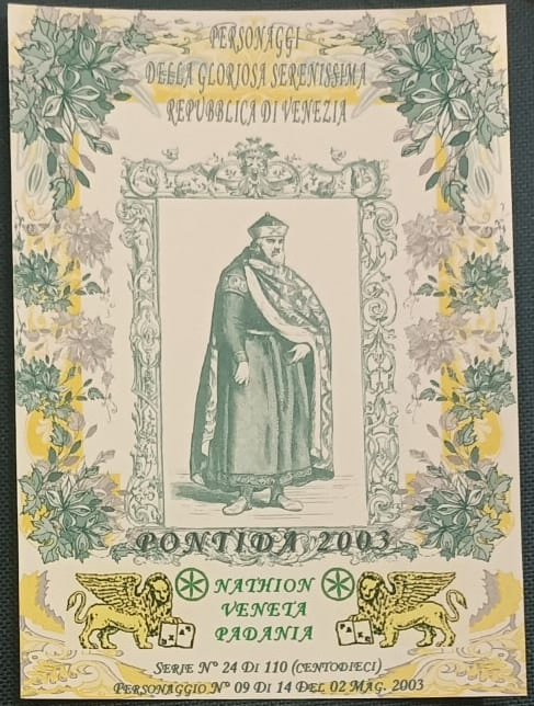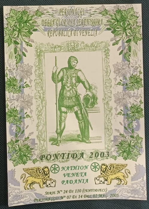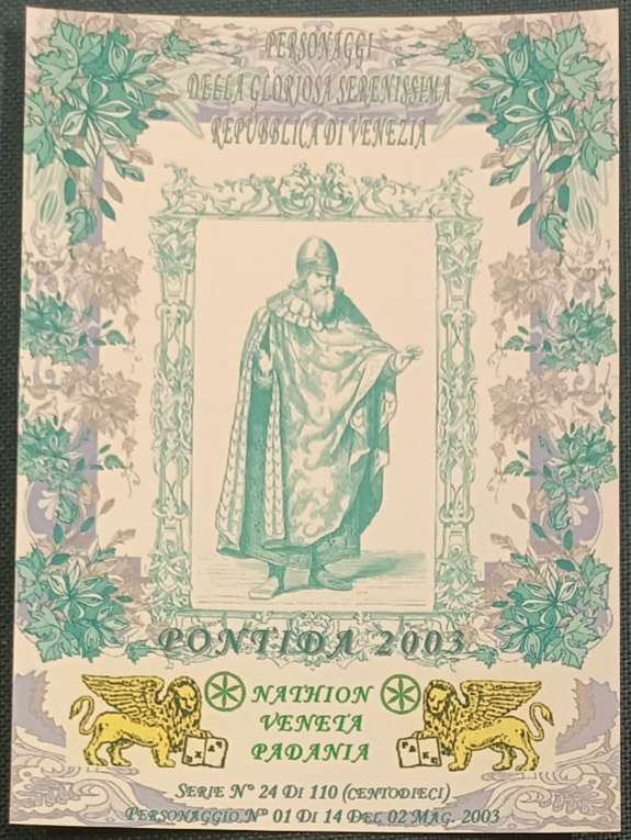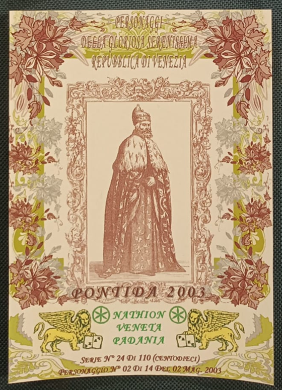 Trattasi di una serie di cartoline emesse in occasione della manifestazione di Pontida del 02/05/2003. Composta da 14 pezzi differenti e numerati, ognuna raffigura un personaggio della gloriosa Serenissima Repubblica di Venezia.